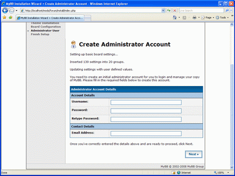 11. จากนั้นระบบจะทำการใส่ค่าเริ่มต้น (Default) ทั้งหมดสำหรับเว็บบอร์ด คลิก Next