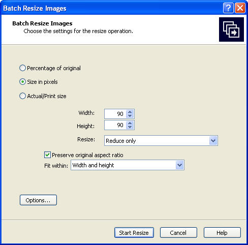3. จะเปิดหน้าต่าง Batch Resize Image ขึ้นมา จากนั้นเลือกรูปแบบการลดหรือขยายตามต้องการ ในที่นี้เลือก Size in pixels