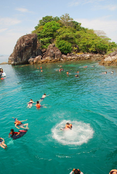เมื่อทุกอย่างกลับมาลงตัว พวกเราก็ไม่รอช้า กระโดด กระเต้น เล่นน้ำ ดำน้ำ กันจนสาแก่ใจ ฮาๆๆ ทริปนี้เขาพาเราไปทั้งหมด 4 เกาะ คือ เกาะทองหลาง เกาะยักษ์เล็ก เกาะรังและเกาะหวาย ซึ่งทั้ง 4 เกาะนี้ใช้เวลาทั้งหมดก็ร่วม 1 วันพอดี มีอาหาร ผลไม้และน้ำบริการบนเรือพร้อมเสร็จสรรพ