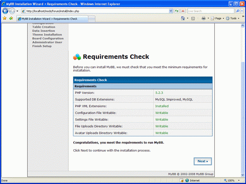 8. เข้าสู่หน้า Requirements Check เพื่อตรวจสอบระบบและความพร้อมของโปรแกรมที่ต้องการในการติดตั้ง MyBB เมื่อทุกอย่างโอเคแล้ว คลิก Next