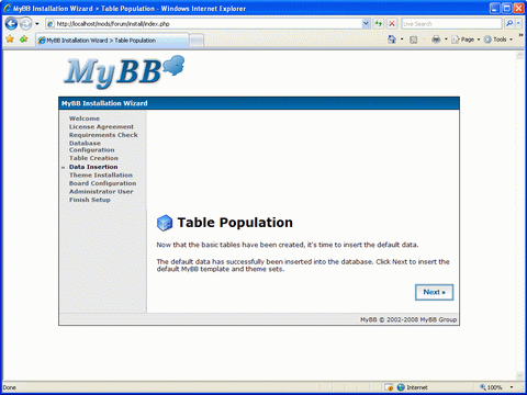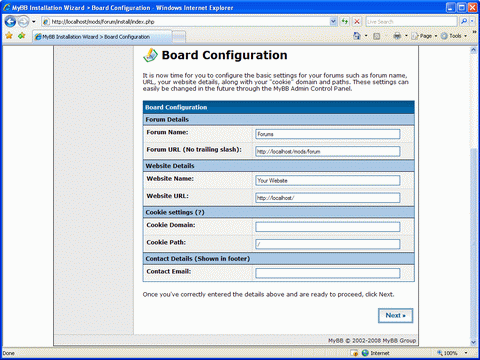 11. จากนั้นระบบจะทำการใส่ค่าเริ่มต้น (Default) ทั้งหมดสำหรับเว็บบอร์ด คลิก Next