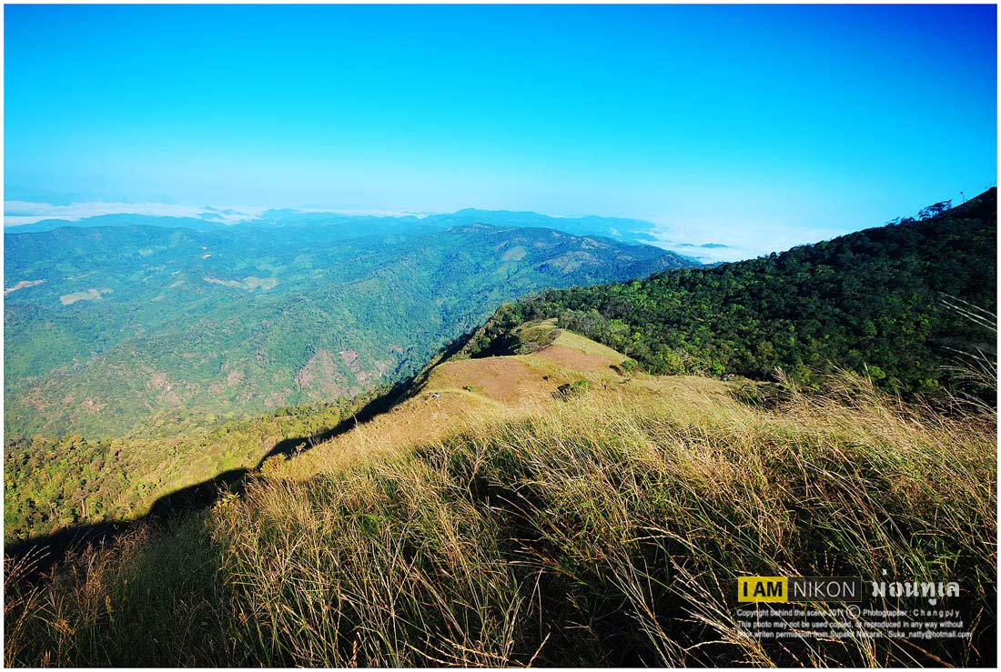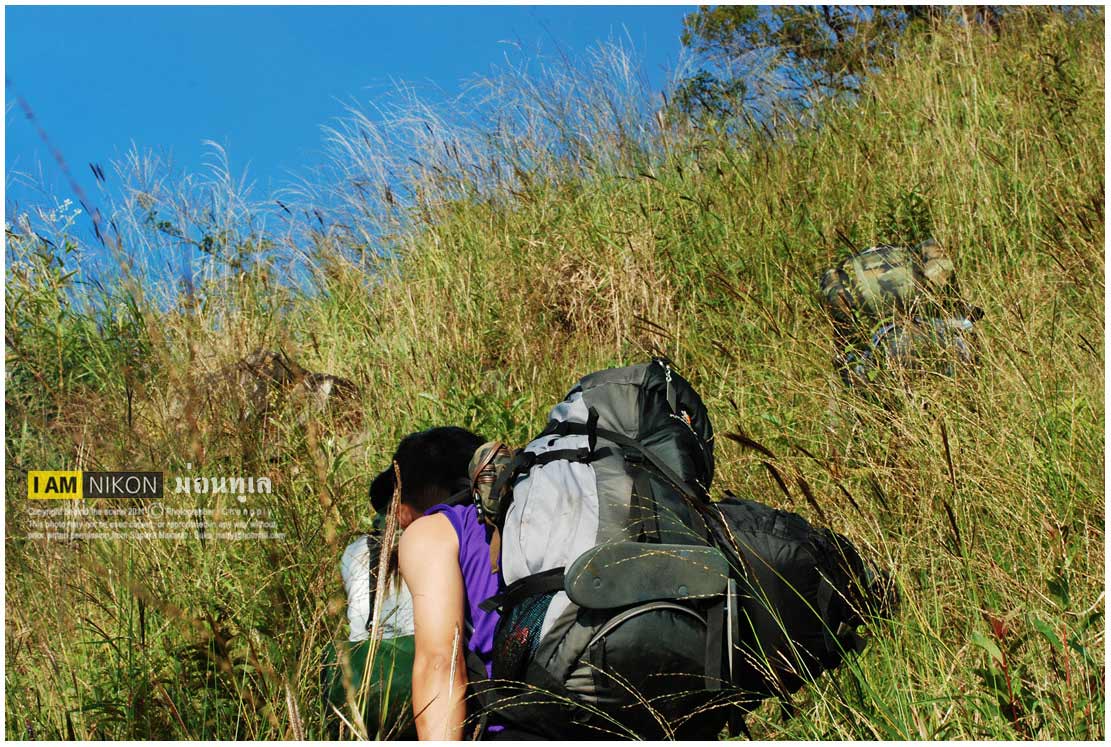 หนทางข้างหน้าเริ่ม ไต่ระห่ำ มีเพียงกอหญ้าให้ยึดเหนี่ยว ความชัน ระดับ 60-70 องศา