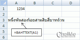 ตัวอย่างดังภาพเป็นตัวอย่างการแปลงตัวเลขจาก cell A1 ให้เป็นตัวหนังสือและเพิ่มคำว่าบาทต่อท้าย