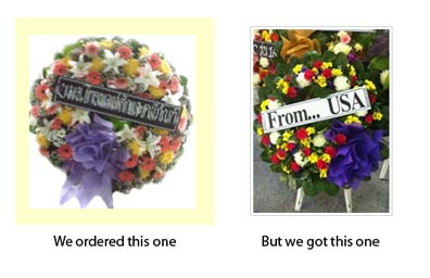 สั่งดอกไม้ไปแบบหนึ่งซึ่งในรูปดูสวยงาม ดอกไม้ในรูปก็ดูดีมีราคา แต่พอได้รับ แทบเป็นลม นอกจากจะเป็นดอกไม้ราคาข้างถนนแล้ว การแต่งก็มีใบประดับเกินครึ่ง ดอกไม้ถูกๆเพียงส่วนหนึ่ง พอโทรไปถาม ทั้งลูกจ้าง ทั้งนายจ้าง พูดจาแบบคนที่ไร้การศึกษา เปิดเวปมาเพื่อจะล่อลวงคนให้ผู้บริโภคหลงผิด คิดว่าจะขายของด้วยความบริสุทธิใจ แต่หาไม่ทั้งหลอก ทั้งลวง คิดว่าส่งของให้แล้วก็แล้วไป ไม่สนใจว่าคุณภาพสินค้าต่ำแค่ไหน คิดว่าส่งดอกไม้ให้คนตาย คงไม่ลุกมาด่า ทำอย่างไรก็ไม่เป็นไร อย่าลืมซิ ดอกไม้ให้คนตาย แต่คนเป็นเป็นคนจ่ายตัง แถม ทั้งมรรยาท และการพูดจาก็ต่ำทราม ใครก็ตามคิดว่าจะสั่งดอกไม้ละก็ คิดดูให้ดี และคิดดูให้หนัก ทั้งเจ้าของและลูกจ้าง มีแต่หลอกลวง ส่งงานราคาหกร้อยบาท แต่คิดเงิน พันสองร้อยบาท ขอให้กิจการของเจ้าจงต่ำลง หมดคนให้ความเชื่อถือให้สมกับที่ทำงานด้วยความไม่ซื่อสัตย์ สักวันหนื่งกรรมจะตามสนอง