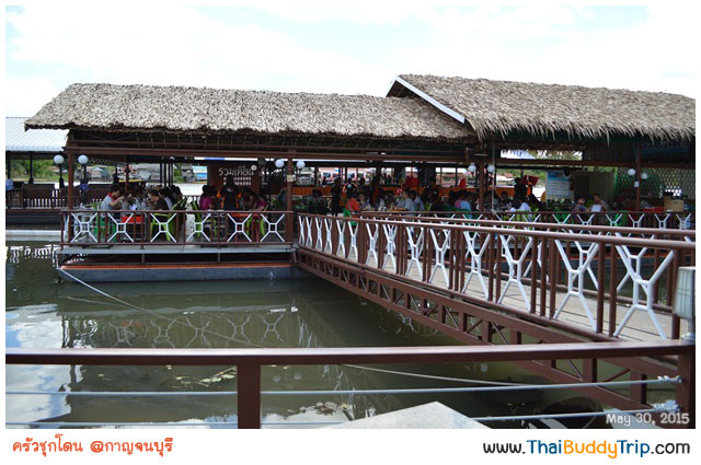ออกเดินทางกันเลยดีกว่า วันเสาร์ที่ 30 มิ.ย. เราเดินทางถึง จ.กาญจนบุรี ประมาณเที่ยงพอดี ระหว่างรถวิ่งก็จัดการค้นหาข้อมูลผ่านมือถือเพื่อหาร้านอาหารฝากท้องมื้อเที่ยง และก็ได้คำแนะนำให้ไปชิมที่ “ครัวชุกโดน” ซึ่งอยู่ในตัวเมืองกาญจนบุรีนั่นเองครับ เป็นร้านติดแม่น้ำแควมีทั้งส่วนที่นั่งบนบกและส่วนที่เป็นแพยื่นลงไปในแม่น้ำ นั่งทานอาหารดูเรือ ดูแพที่วิ่งผ่านไปมาชิลๆ กันไป