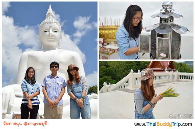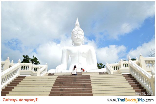 ขับรถเพลินๆ ระหว่างทางหลังจากเลี้ยวขวาที่แยก อ.ทองผาภูมิ เพื่อตามถนนหมายเลข 323 ไปยัง อ.สังขละบุรีนั้น มีพระพุทธรูปสีขาวขนาดใหญ่ สร้างอยู่หน้าของ “วัดท่าขนุน” อ.ทองผาภูมิ เราจึงแวะไหว้พระเพื่อความเป็นสิริมงคลก่อนเดินทางต่อ