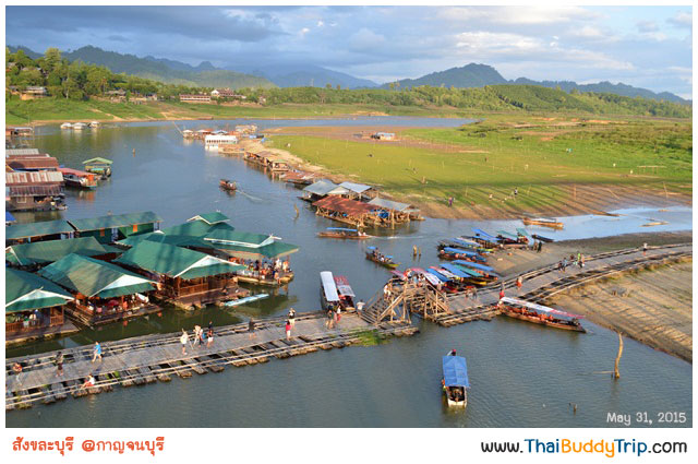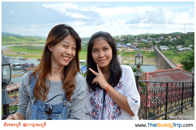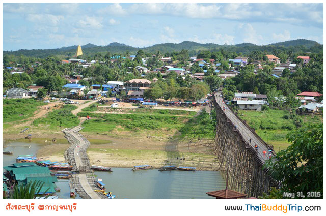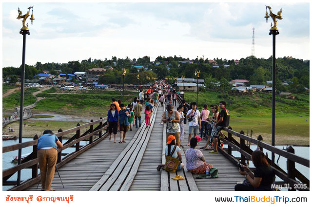เบื้องหน้าคือ “สะพานมอญ” มีชื่ออย่างเป็นทางการว่า “สะพานอุตตมานุสรณ์”​ เป็นสะพานไม้ข้ามแม่น้ำซองกาเลียไปยังหมู่บ้านมอญ ถือเป็นสะพานไม้ที่ยาวที่สุดในประเทศไทย และเป็นอันดับสองของโลกรองจากสะพานไม้อูเบ็งในพม่า และเป็นสัญลักษณ์ของอำเภอสังขละบุรี เป็นสะพานแห่งศรัทธา ที่เกิดจากการร่วมแรงร่วมใจของชุมชนที่อาศัยอยู่ในสังขละบุรี