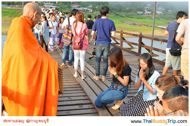 06.30 น. เราเดินออกจากที่พักก็เห็นบรรยากาศและเดาได้เลยว่าคนน่าจะเยอะแน่เพราะทั้งรถทั้งคนเต็ม 2 ข้างถนนไปหมด เราหยุดซื้อชุดตักบาตรและอาหารแห้ง จากเด็กที่ตั้งโต๊ะขายข้างทางชุดละประมาณ 40 บาท แล้วก็ตรงไปยังสะพานทันที